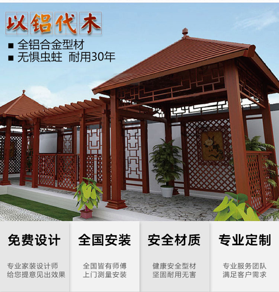 涼亭長(zhǎng)廊系列是演繹自然與生活的交融,創(chuàng)新的鋁合金框架加以表面木紋處理完美承襲生活所追求自然的經(jīng)典魅力,而它的設(shè)計(jì)靈魂正是根源于當(dāng)下所倡導(dǎo)的自然環(huán)保。此外,采用完美的建筑材料——水印氟碳木紋鋁型材,可在視覺(jué)上營(yíng)造出與自然對(duì)稱和諧之美,并具有耐候性、耐磨損、耐腐蝕性,硬度高、不易變形、仿木真圖案不褪色、不脫落等優(yōu)越特點(diǎn),呈現(xiàn)出自然與環(huán)保的平衡布局,成為經(jīng)久不衰的典雅風(fēng)格化身。