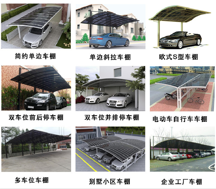 款式選擇:單邊式車棚、合抱式車棚、斜拉式車棚、歐式S型車棚