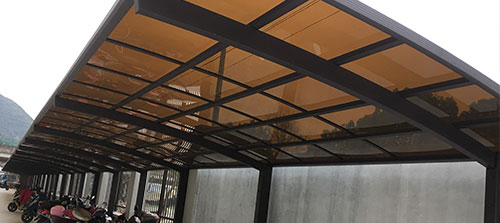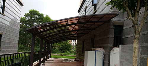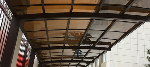 頂棚采用進口聚碳酸酯板,抗沖擊比玻璃強,有效防止高空墜物
